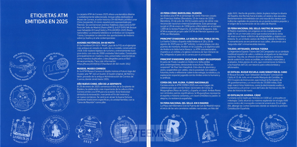 Décima carpeta resumen anual editada por el servicio filatélico de Correos en diciembre de 2025 con todos los diseños ATM emitidos a lo largo del año. Incluye doce emisiones; diez de España y dos de Andorra (administración postal española).