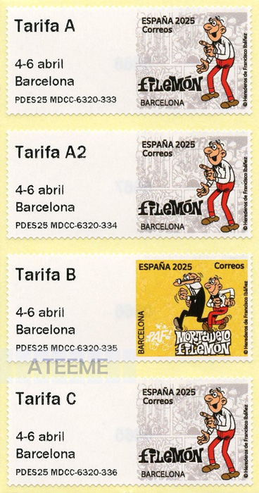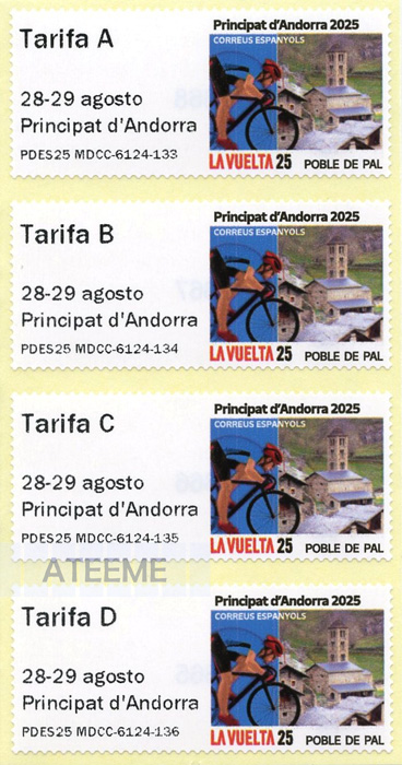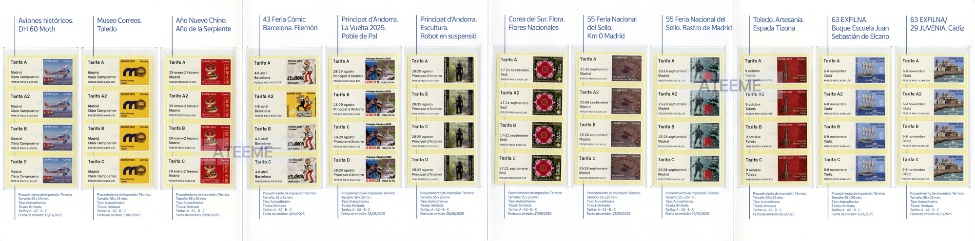 Todas las emisiones están incluidas en tiras nuevas de cuatro sellos de valor variable con la serie o los cuatro indicadores de valor facial programados en los equipos emisores en cada país (ver tablas inferiores); Tarifa A-A2-B-C para las emisiones de España, y Tarifa A-B-C-D para las emisiones de Andorra, colocadas en filoestuches protectores.
