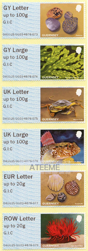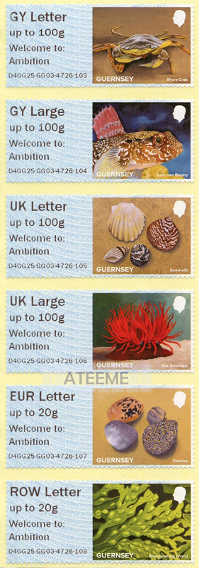 | Design: | Bailiwick seashore (Shore crab, Common Blenny, Seashells, Sea Anemone, Pebbles, Bledderwrack (Vraic)) Bailiwick seashore + permanent imprint ‘Envoy House‘ |