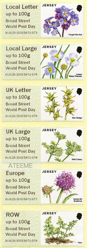 JERSEY Design: Protected Plants (Devil’s-bit Scabious, Jersey Fern, Jersey forget-me-not, Lesser Water-plantain, Jersey Wild Celery, Star Sedge)Protected Plants + permanent imprint ‘Jersey Post HQ ‘Issue date: February 28th 2025 More information: Jersey, ‘Post&Go’ issues basic information