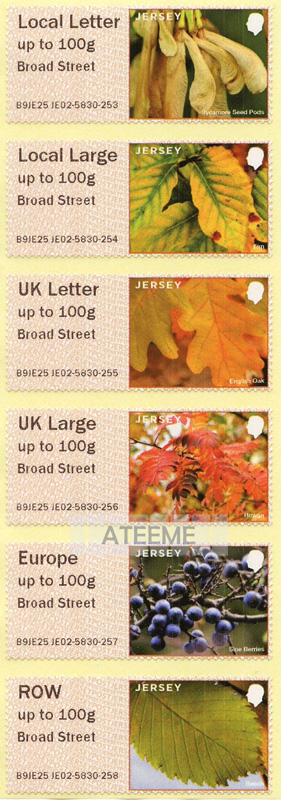 | Design: | Colours of Autumn (Sycamore, Elm, English Oak, Rowan, Sloe Berries, Beech) Colours of Autumn + permanent imprint ‘Broad Street‘ Colours of Autumn + permanent imprint ‘Jersey Post HQ‘ |