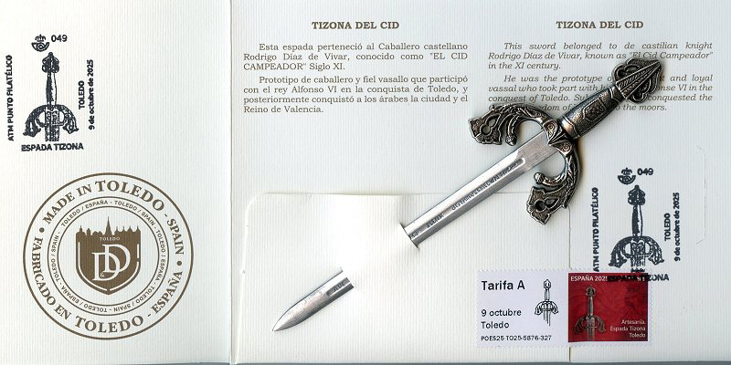 Aún así, el servicio filatélico decidió seguir adelante con su programación y organizó un pequeño evento filatélico en la oficina principal de Correos de Toledo el jueves 9 de octubre, coincidiendo con el Día del Correo. Durante este evento presentó un nuevo diseño ATM dedicado a la espada Tizona y también emitió sellos de valor variable con su equipo informático de sobremesa con el diseño básico ilustrado con el logotipo del nuevo museo; ambos diseños con la impresión especial ‘9 octubre Toledo‘ en dos líneas bajo el indicador de valor facial.