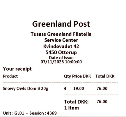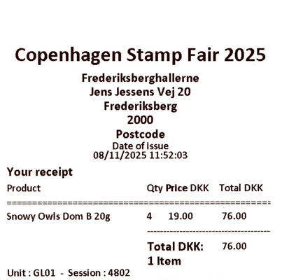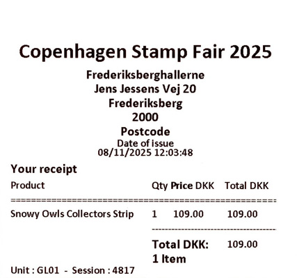 Los sellos de la serie ‘Snowy Owls’ emitidos durante los dos días en Frederiksberg con el equipo GL01 incluyen la impresión temporal ‘Copenhagen 2025‘ bajo el valor facial. Esta edición especial queda también reflejada en el encabezamiento de los recibos.