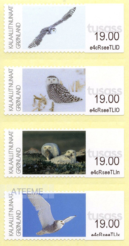 Los sellos impresos con impresoras aCon (tira inferior izquierda) incluyen tan sólo el valor facial en coronas danesas y un código único para cada sello. Los tres primeros dígitos permiten reconocer el equipo emisor; el departamento filatélico de Tusass Greenland dispone de tres impresoras aCon, dos instaladas en las oficinas de Nordfrim A/S en Otterup, Dinamarca (código empezando por e4c y erG), y la tercera en la oficina de Sisimiut, en Groenlandia (código TFD).