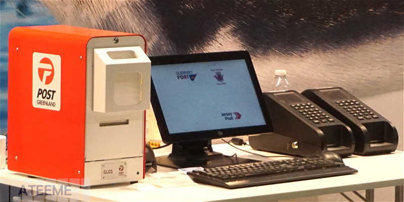 Tusass Greenland Filatelia instaló tres equipos para la emisión de sellos de valor variable en el estand. En la imagen inferior, el quiosco DKU GL01 y las dos impresoras de sobremesa aCon (códigos e4c y erG).