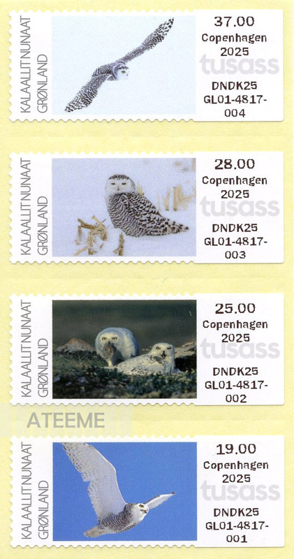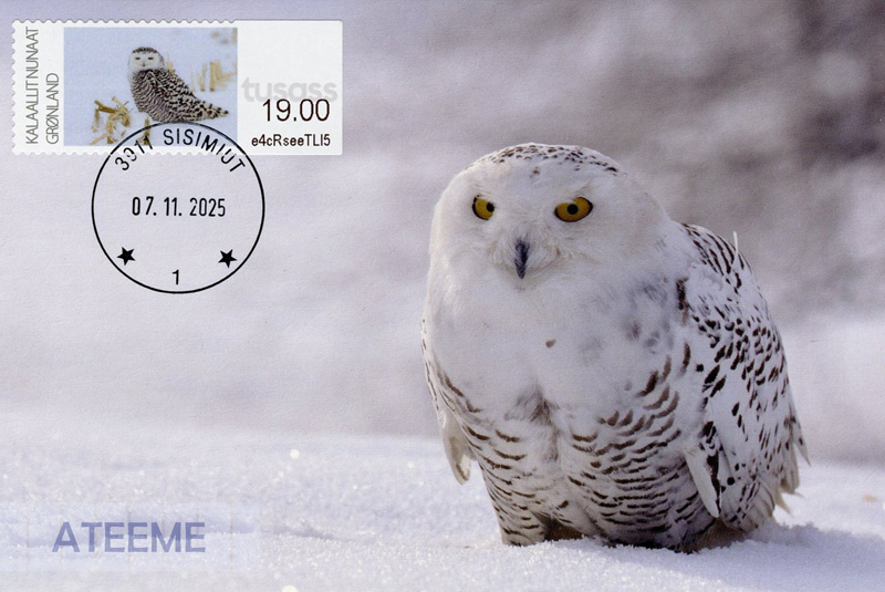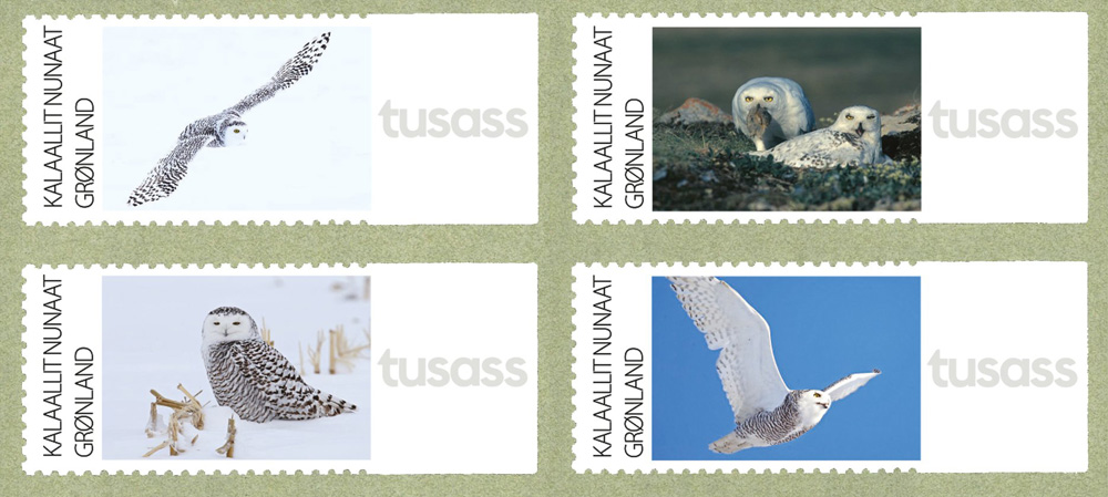 Un año más -y ya van siete- Tusass Greenland Filatelia, el servicio filatélico de Groenlandia, ha dedicado la serie anual de sellos de valor variable a una de las especies animales que habitan la isla. Tras los osos polares, perros de trineo, focas, morsas, águilas de cola blanca y zorros árticos, la serie de 2025 está dedicada a los búhos nivales.